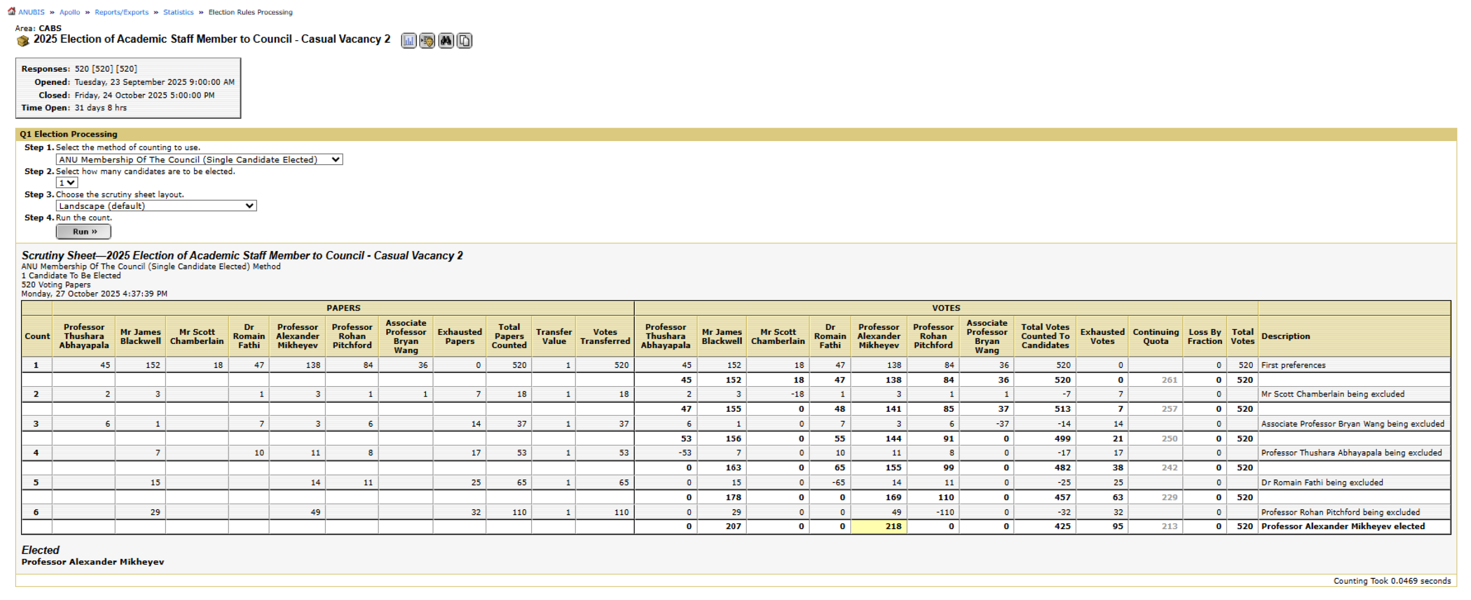 Following the voting close on Friday the 24th of October, the electronic count was conducted by the Returning Officer and University Governance Office via Zoom videoconference at 4:30pm Monday 27 October 2025, with one nominated scrutineer in attendance.
